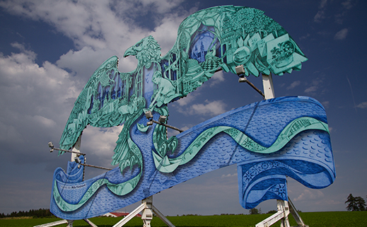„Krídla orla zastrešujú snovo-lineárne stvárnenie krajiny, tak, ako ju nosím vo svojom duchu, nech som kdekoľvek na svete. Farby som zvolila tak, aby celé dielo zasahovalo do krajiny s určitou jemnosťou a v niektorých momentoch s ňou až splývalo, tak ako splývajú naše spomienky s realitou, ktorú práve zažívame,“ dodáva autorka.